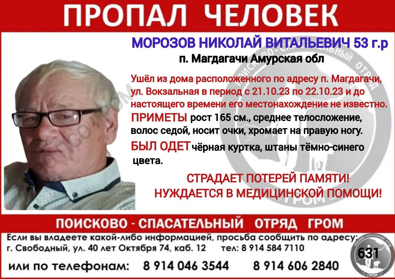 В Амурской области разыскивают Николая Витальевича Морозова 1953 года рождения. Пенсионер ушёл с адреса на улице Вокзальной в посёлке Магдагачи в период с 21 по 22 октября, где находится сейчас...