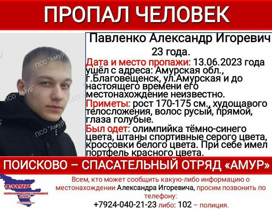 В четверг, 27 июля, в редакцию Амур.инфо пришла сестра 23-летнего Александра Павленко, который пропал 13 июня 2023 года. Девушка рассказала, что молодой человек уехал с друзьями в село Передовое. Но...
