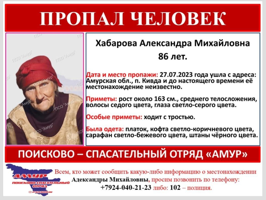 27 июля в посёлке Кивда пропала 86-летняя Александра Михайловна Хабарова, её местонахождение до сих пор неизвестно, сообщает поисково-спасательный отряд «Амур». Рост пропавшей около 163 сантиметров, у пожилой женщины среднее телосложение,...