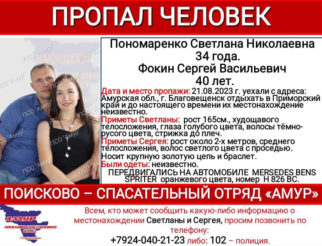 Поисково-спасательный отряд «Амур» сообщил о поисках пары из Благовещенска – 34-летней Светланы Пономаренко и 40-летнего Сергея Фокина. Амурчане отправились отдыхать в Приморский край 21 августа на своём автомобиле, но перестали...