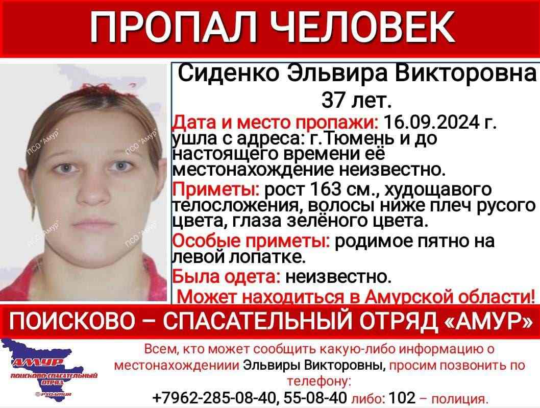 37-летняя Эльвира Сиденко пропала в Тюмени 16 сентября нынешнего года. Местоположение женщины до сих пор не установлено. Об этом сообщили в поисково-спасательном отряде «Амур». Поисковики отметили, что Эльвира может находиться...