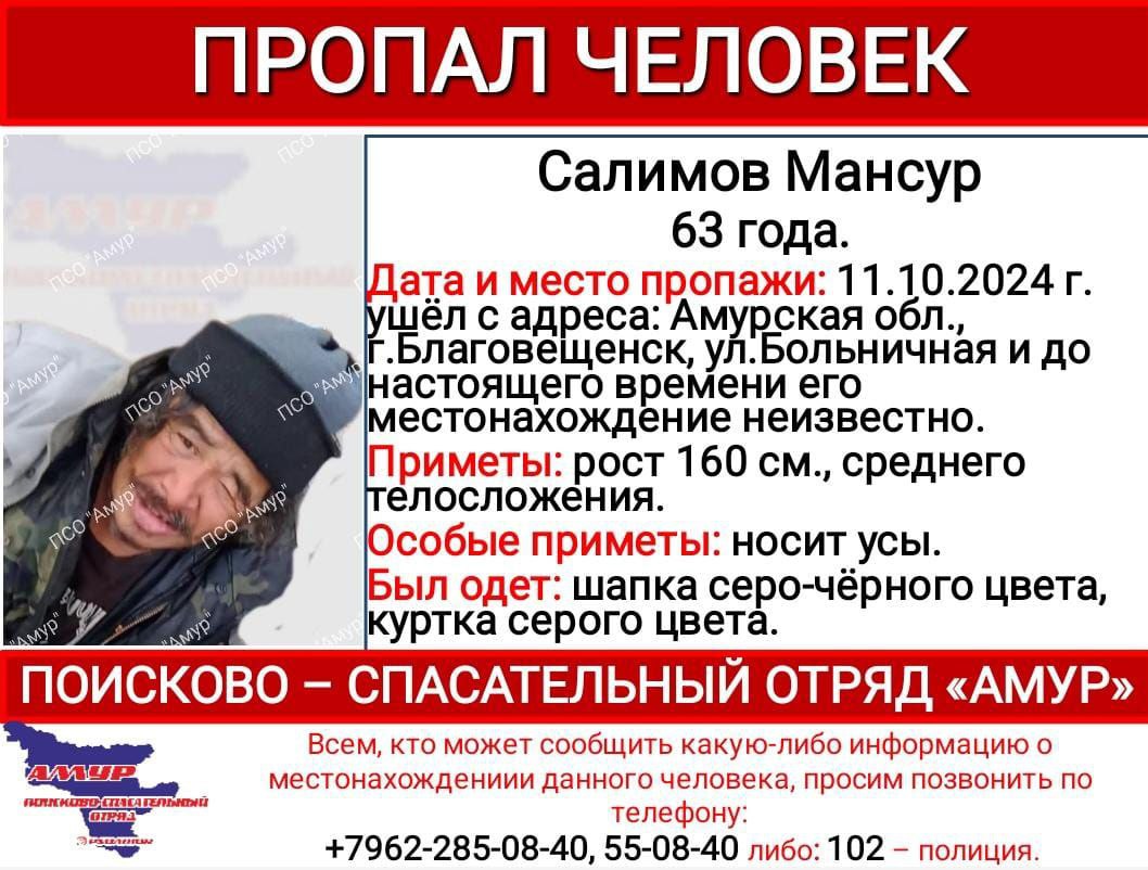 В Благовещенске ищут 63-летнего Мансура Салимова. Об этом сообщили в поисково-спасательном отряде «Амур». Мансур Салимов ушел с адреса на улице Больничной 11 октября и пропал. У мужчины среднее телосложение, рост...