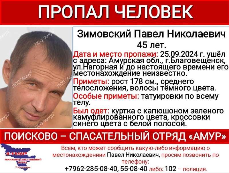 45-летний Павел Зимовский пропал 25 сентября нынешнего года. Он ушел с улицы Нагорной в Благовещенске. Где мужчина находится сейчас неизвестно. Об этом сообщили в поисково-спасательном отряде «Амур». Рост Павла –...