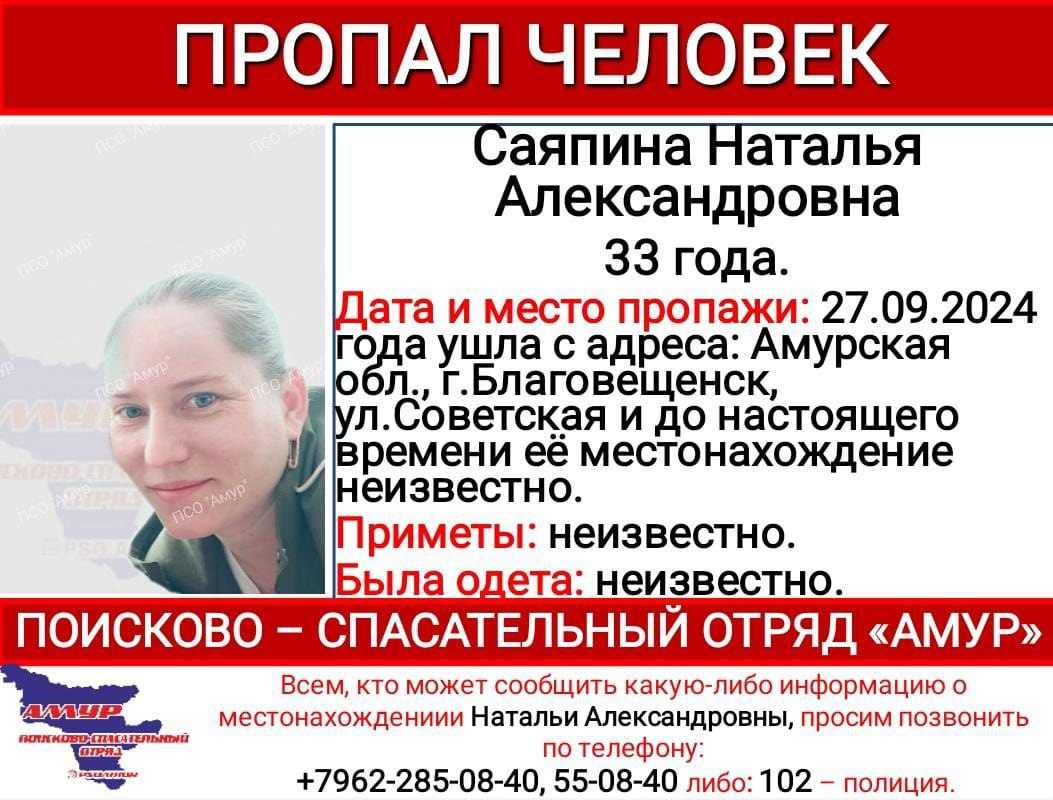 В Благовещенске ищут 33-летнюю Наталью Александровну Саяпину. Об этом сообщили в поисково-спасательном отряде «Амур». Наталья ушла с адреса на улице Советской 27 сентября и пропала. Во что она была одета...