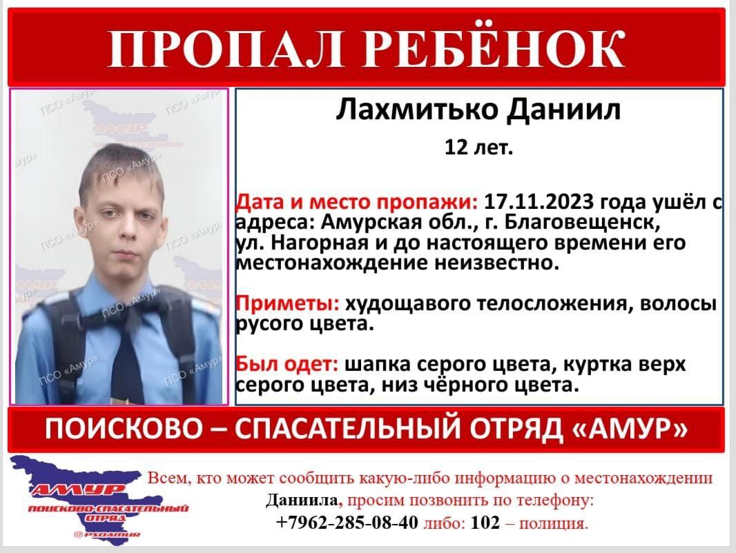 В Благовещенске пропал 12-летний Даниил Лахмитько. Мальчика ищут с 17 ноября. О поисках рассказал поисково-спасательный отряд «Амур». В день пропажи Даниил ушёл с адреса на улице Амурской. Он был одет...