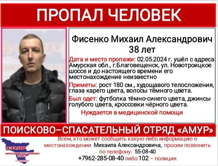 В Амурской области ищут 38-летнего Михаила Александровича Фисенко. Мужчина пропал 2 мая в Благовещенске – он ушёл с адреса на Новотроицком шоссе. Об этом сообщил поисково-спасательный отряд «Амур». У Михаила...