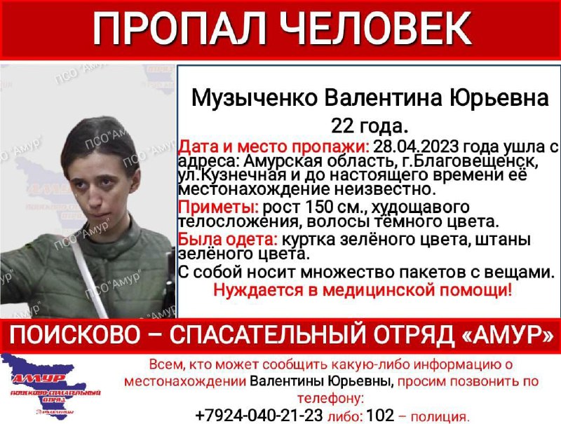 В Благовещенске из дома на улице Кузнечной в пятницу, 28 апреля, ушла и до сих пор не вернулась 22-летняя Валентина Юрьевна Музыченко. Девушка нуждается в медицинской помощи, сообщает поисково-спасательный отряд...