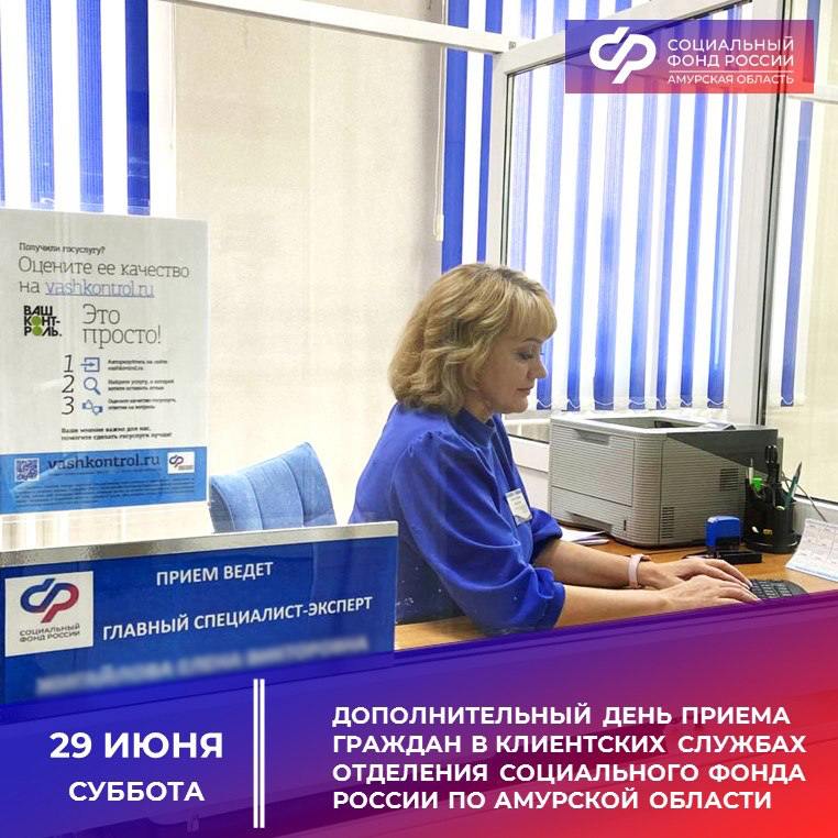 Дополнительный день приема граждан в клиентских службах Социального фонда России по Амурской области выпадает в июне на 29 число. В этот день в Белогорске, Свободном и Благовещенске клиентские службы будут...