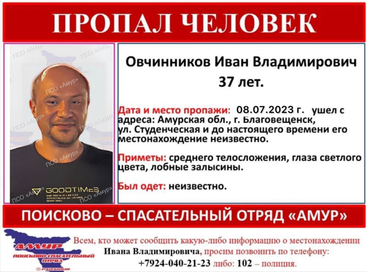 В областном центре объявлен поиск пропавшего человека. ПСО «Амур» сообщает о безвестном исчезновении Ивана Овчинникова, 37 лет от роду. Мужчину последний раз видели на улице Студенческой 8 июля. Уже почти...