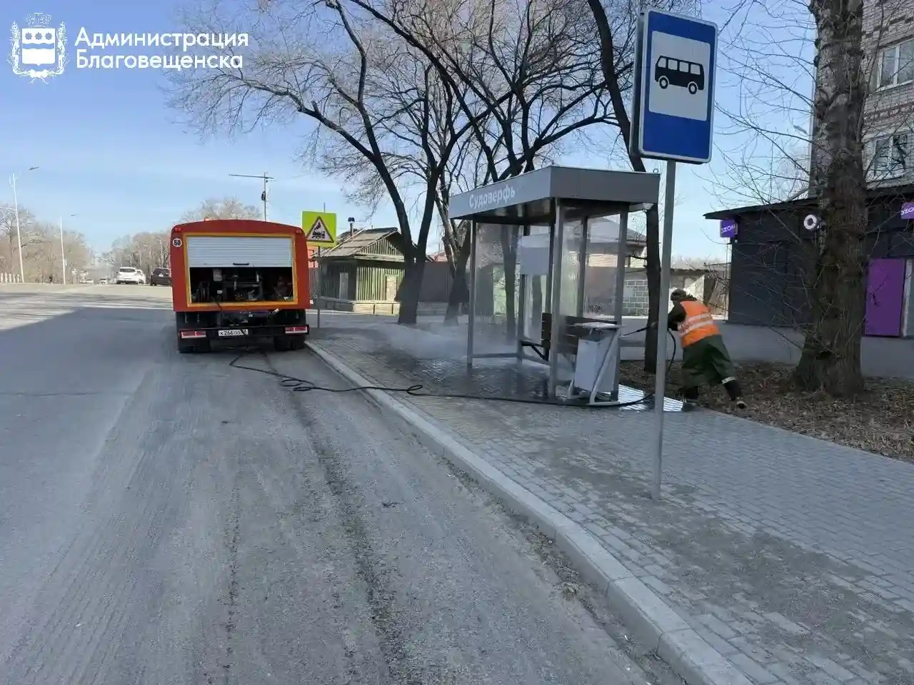 На улицы областной столицы вышла подметально-уборочная техника с навесом для полива дороги. Влажную уборку коммунальщики проводят каждый тёплый сезон. Техника уже отработала на Зейской, Амурской, Театральной от Ленина до круговой...