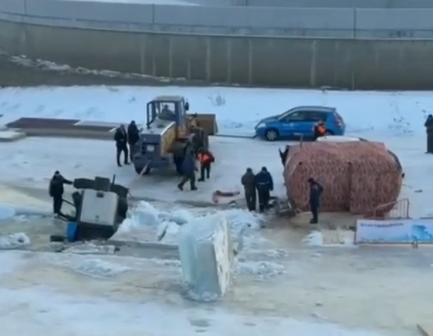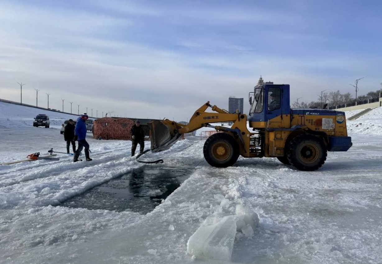 Во льду Амура в Благовещенске вырубают бассейн